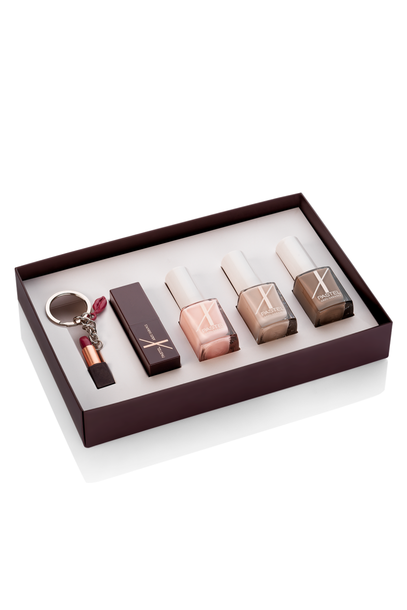 Bu set; oje, ruj ve aksesuarı bir araya getiren özel bir hediye seçeneğidir.