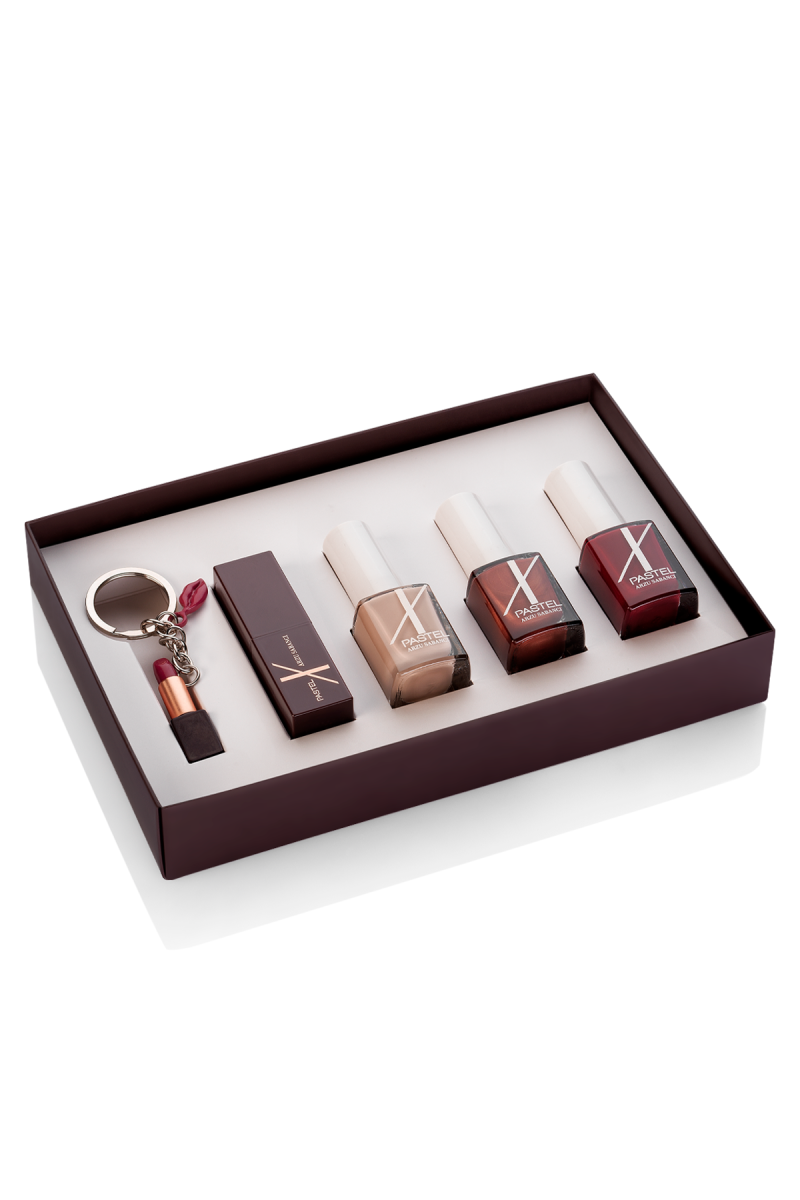Bu set; oje, ruj ve aksesuarı bir araya getiren özel bir hediye seçeneğidir.
