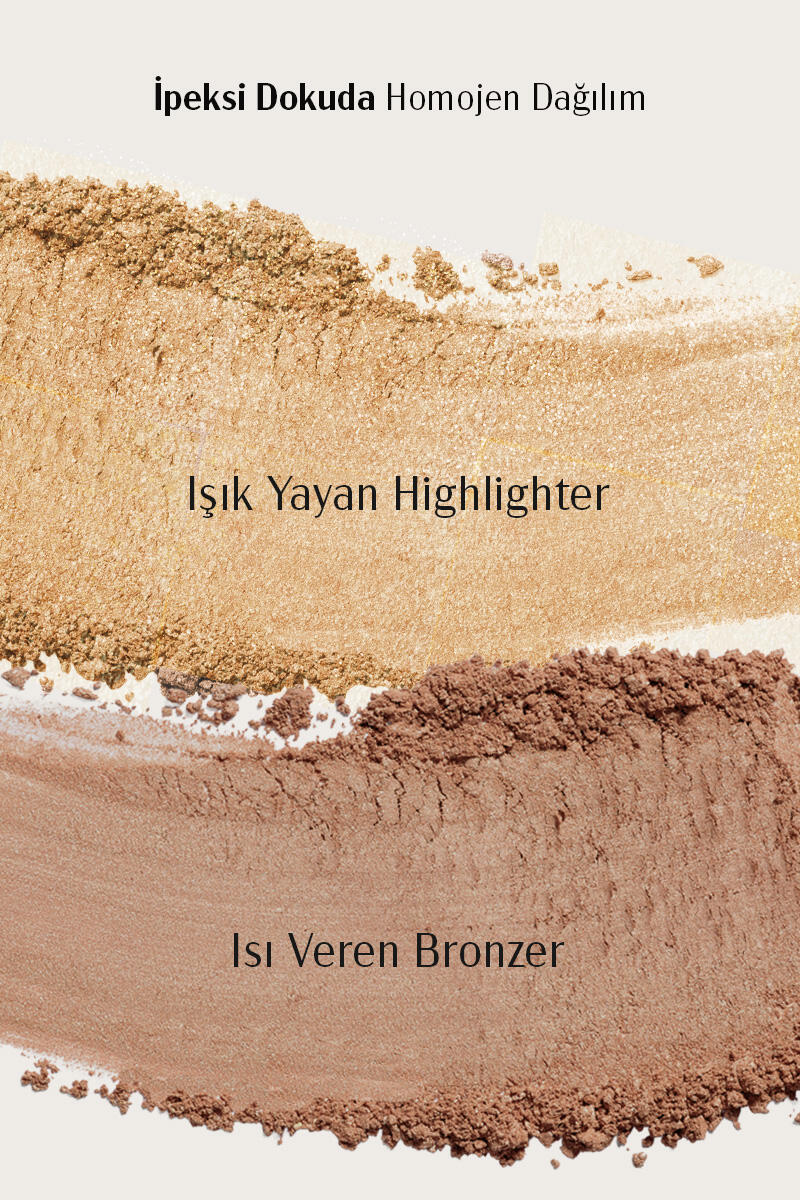 Bronzer ve highlighter uyumu, her cilt tonuyla bütünleşir. Hafif yapısı ciltte ağırlık hissi yaratmadan gün boyu taze ve ışıltılı bir görünüm sunar.