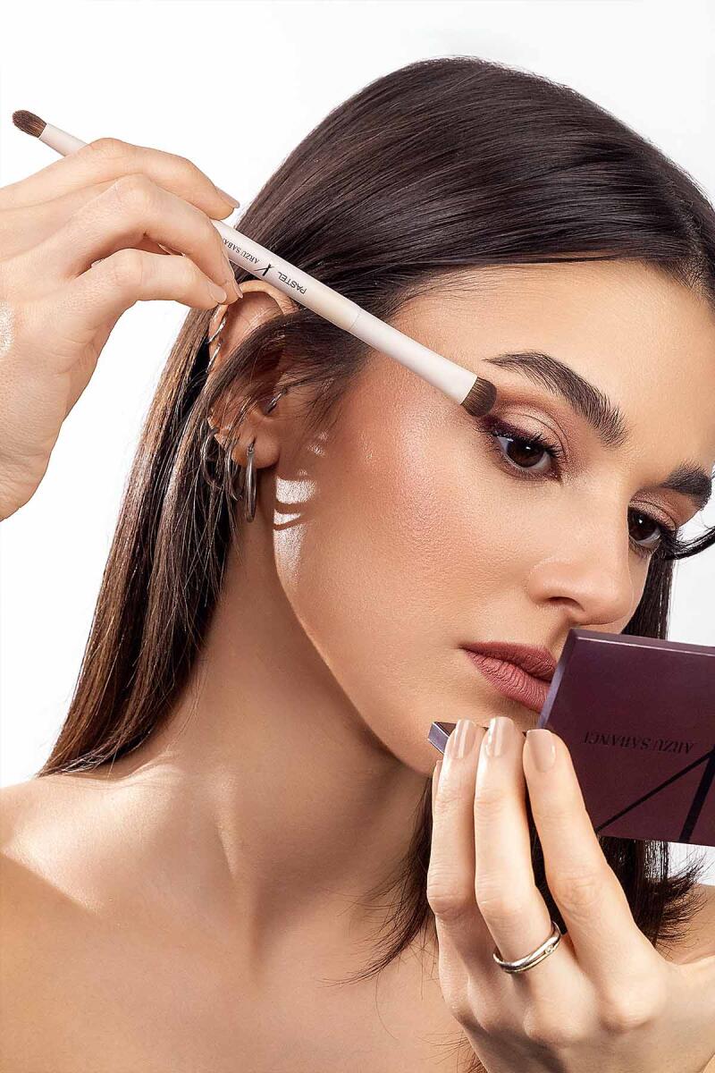 Setin en güçlü tamamlayıcısı olan Pastel x Arzu Sabancı Small Duo Brush, çift taraflı yapısıyla çok yönlü kullanım sunar.