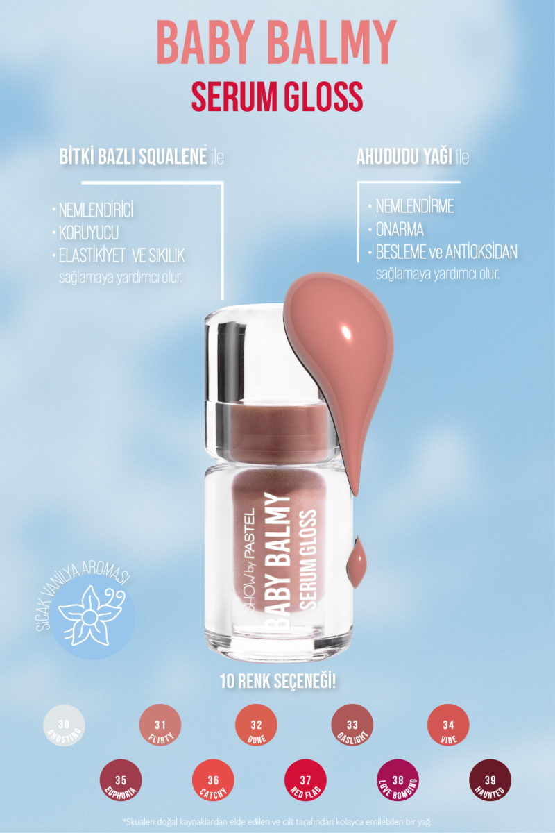 Baby Balmy Serum Gloss sayesinde dudaklarınız her zaman canlı ve bakımlı görünür. Ürünün sağladığı üstün nem ve bakım etkisi ile dudak sağlığınızı korur ve güzellik rutininize yenilik katar. Eşsiz formülü, sürekli kullanımda dudaklara ihtiyaç duyduğu nemi ve bakımı sunarak, her gün yumuşak ve dolgun görünmelerini sağlar. Dudakların doğal elastikiyetini koruyarak çatlamaların ve kuruluğun önüne geçer. Baby Balmy Serum Gloss, yalnızca uyumluluğu ve etkinliği ile değil, aynı zamanda dudaklarda bıraktığı hafif ve kadifemsi dokunuş ile de kullanıcılarını memnun eder. Günlük kullanım için ideal bu dudak balmy, vazgeçilmez dudak bakım ürününüz olacak. Yoğun iş temposunda ya da dışarıda geçirilen uzun günler boyunca dudaklarınıza gereken bakımı sağlamak, bu ürün sayesinde artık çok daha pratik hale geliyor.