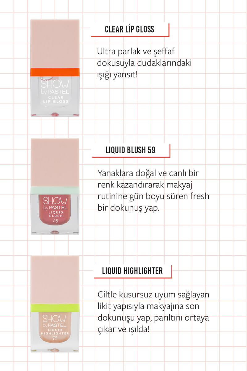 Küçük boy, büyük enerji! Show By Pastel Glow-Up Girl Mini Liquid Blush, ikonik Show Your Joy Liquid Blush formülünü şimdi Glow-Up Girl koleksiyonuna özel 2.1 ml mini boyutuyla sunuyor. Kompakt tasarımı sayesinde günlük makyaj çantanda her an yanında taşıyabileceğin bu mini allık, pratikliğiyle kısa sürede favorin olacak.