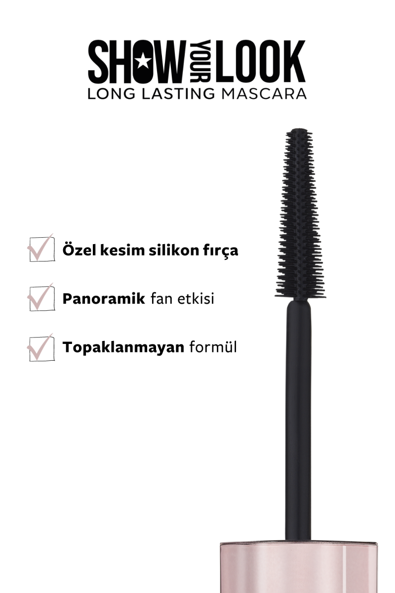 Topaklanma yapmadan kirpikleri tek tek ayıran Show Your Look Maskara, volume etkisiyle kirpiklere ekstra hacim verir. 24 saat kalıcı etkisiyle gün boyu daha siyah ve kusursuz bakışlara sahip olmanızı sağlar. Özel silikon fırçası sayesinde kirpikleri kökten uca doldurarak panoramik fan etki sağlar. Water-resistant özelliğiyle sıcağa, neme ve suya dayanıklıdır. İçeriğindeki bitki özleriyle kirpiklere bakım yaparak besler. Show Your Look Maskara ile sahne senin, Show'unu göster! Cruelty free, vegan ve oftalmolojik onaylıdır. Glüten içermez.